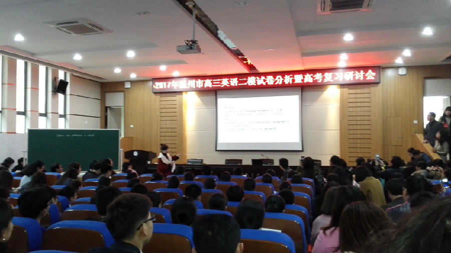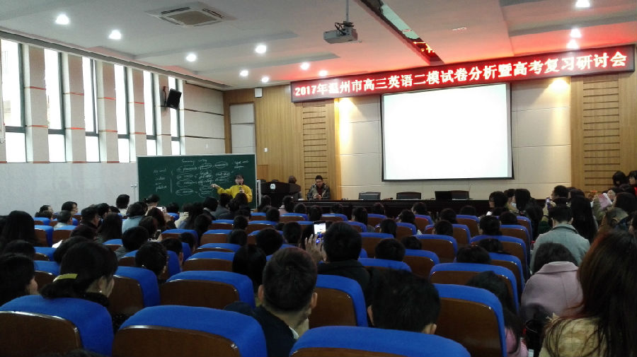 316日,温州八高崇德楼罗山厅里,人头攒动,盛况空前——2017年温州市高三英语高考复习研讨会暨郑秋秋名师工作室第三次研修活动在这里隆重举行。来自温州市各县市区300多名高三英语老师代表积极参加了此次活动,不仅过道坐满了与会老师,就连报考厅门口也站满了认真听课的老师。