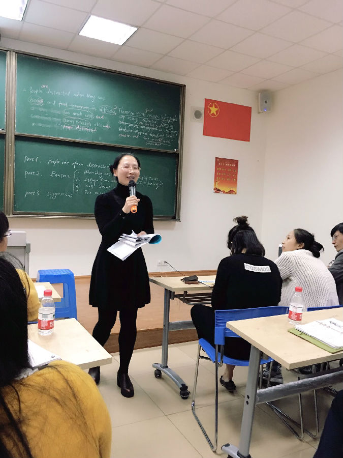 课后两位老师阐述了自己的备课思路。工作室助理张敏老师对这两堂课进行了综合点评。秀外慧中温文尔雅的张老师从更高的高度和更专业的角度肯定了这两堂课的优点,也提出了一些建议,如续写和概要写作时,我们更应从学生的角度思考,并且关注写作的速度、outline大纲、思维导图、topic sentences,让在座的老师们如沐春风,豁然开朗。