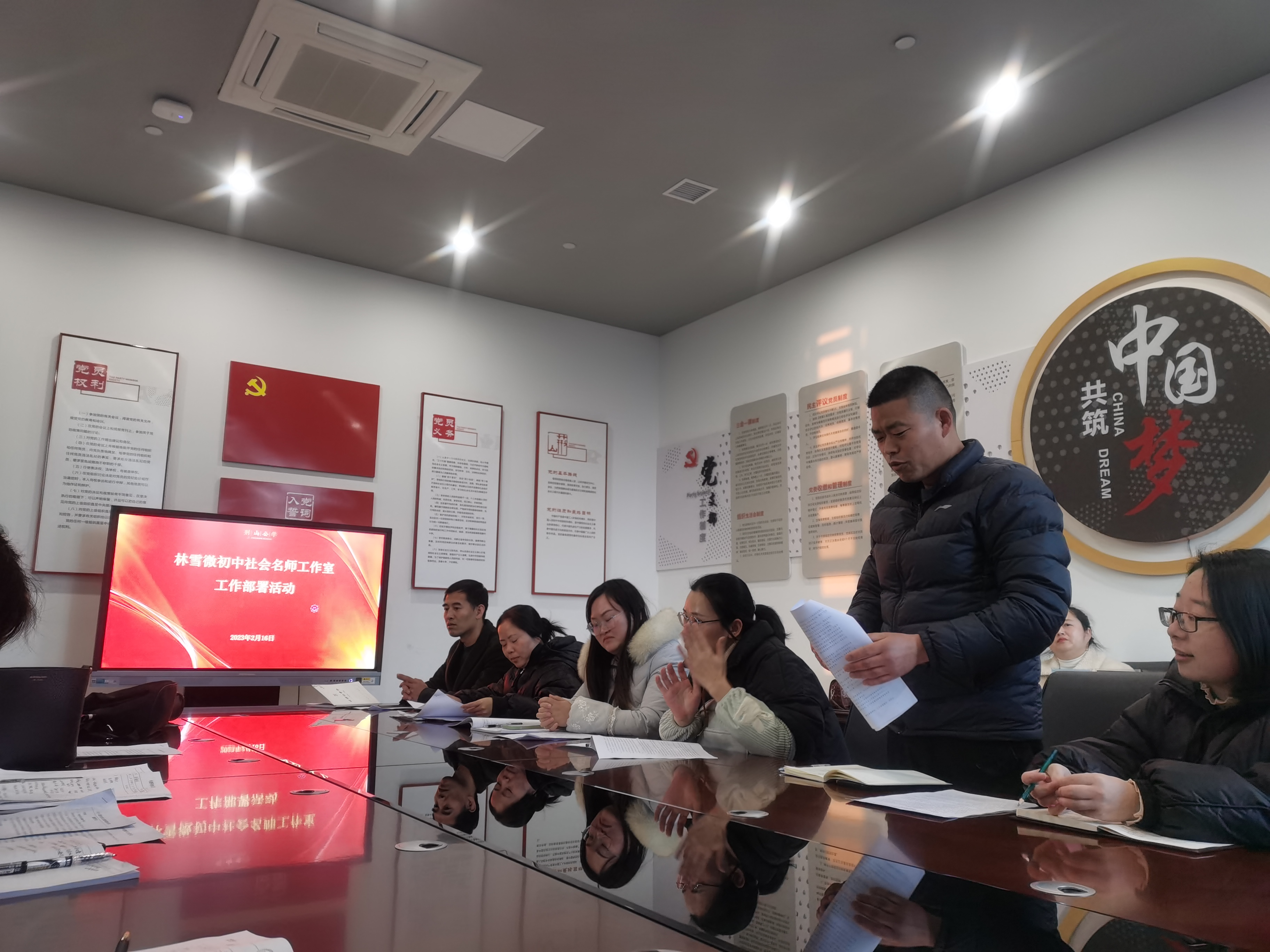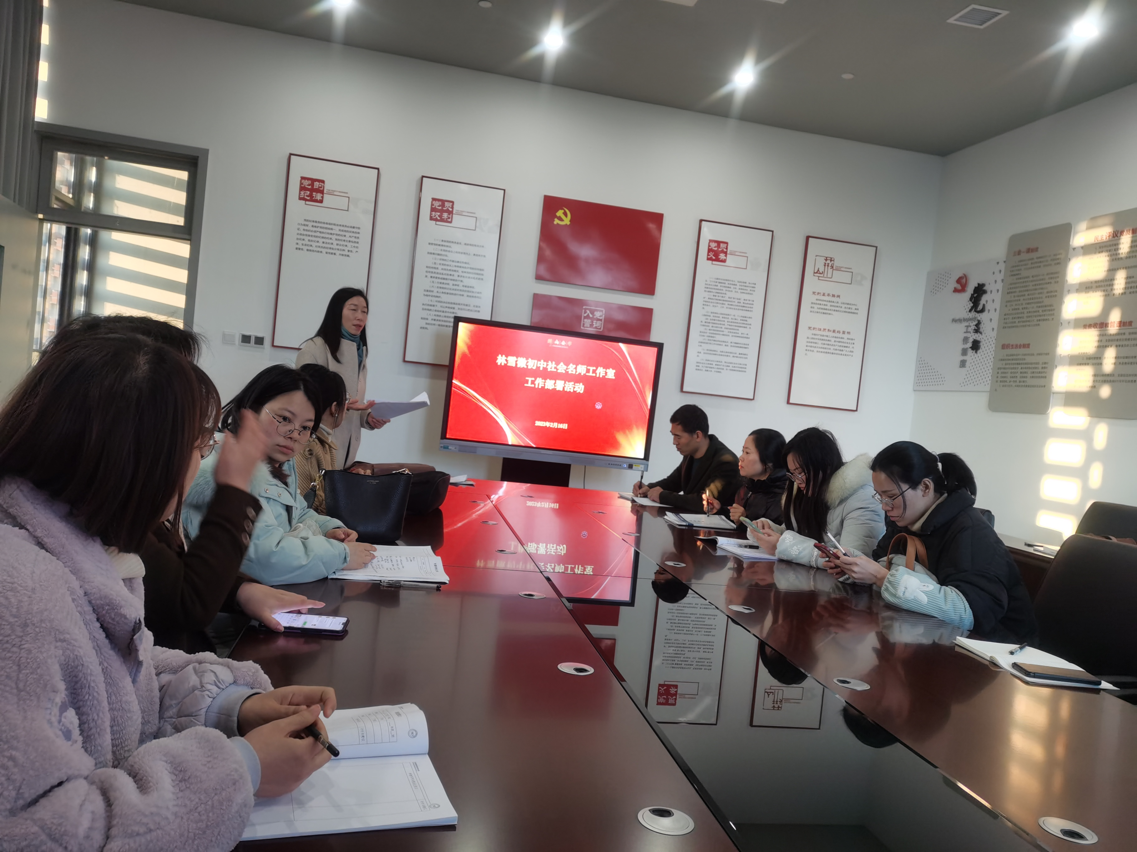 第八项议程由两大名师工作室分头布置任务。林雪微初中社会法治名师工作室在林特的带领下,首先开展破冰行动,各学员进行了各具特色的自我介绍及目标介绍,加深了学员之间的相互了解。接着林老师对工作室的工作做了整体安排,强调专业阅读、课堂观察、读书沙龙、论文评改、课题研讨、命题探析在专业成长中的重要性,要求每位学员每次工作室活动后及时完成开课评课稿与活动总结。