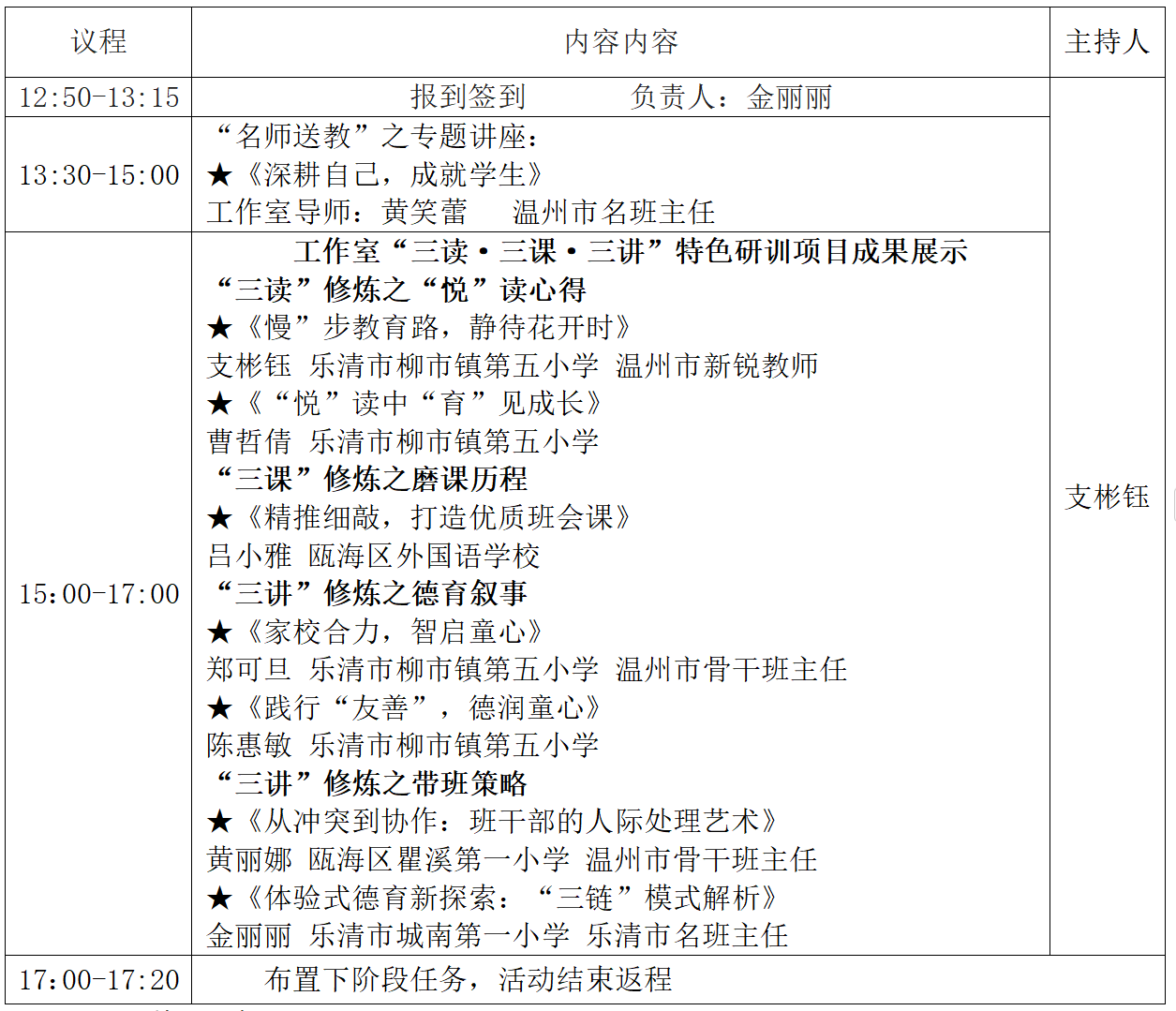 贯彻《教育部关于进一步加强中小学班主任工作的意见》文件精神,为发挥名师的示范辐射作用,加快班主任队伍建设,提高班主任专业素养决定举行第三期温州市黄笑蕾名班主任工作室名师送教活动暨第24次集训之“三读·三课·三讲”项目研修成果展示。现将有关事项通知如下: