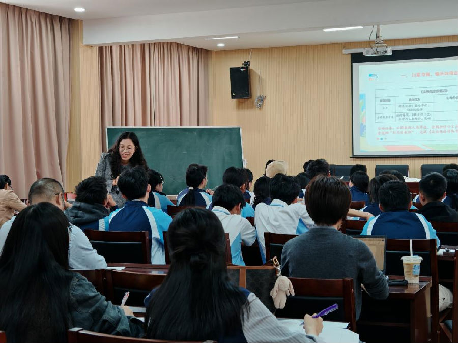 温州市第二中学潘沉舒老师的《树立法治观念》创新采用"普法宣传员"角色任务课堂伊始,潘老师通过人物形象辨析,引导同学们结合“手持法律文本”“胸口公平标志”等细节,准确识别出“普法宣传者”身份,并顺势提问“生活中是否接触过普法宣传者”,随后展示校内法制教育活动照片,唤醒同学们的生活记忆。当同学们意识到以往多是“被普法者”时,潘老师介绍了将于11月正式施行的法制宣传教育法,强调该法将普法纳入法治轨道,鼓励大家从“被动接受”转变为“主动传播”,争当“小小普法宣传员”。课堂核心环节,潘老师以手机群聊为场景引入案例:群内出现辱骂小新的言论,朋友附和并制作其P图表情包。潘老师通过模拟“手机震动”的互动感,引导同学们以旁观者视角思考应对方式,现场示范“以案释法”,让普法知识与生活场景深度融合。通过多角度多主体的视角,引导学生从微信群辱骂等真实案例出发,分小组从权益守护、红线警示、观察实践等角度研讨,理解法律作用与法治信仰引导学生树立法治意识