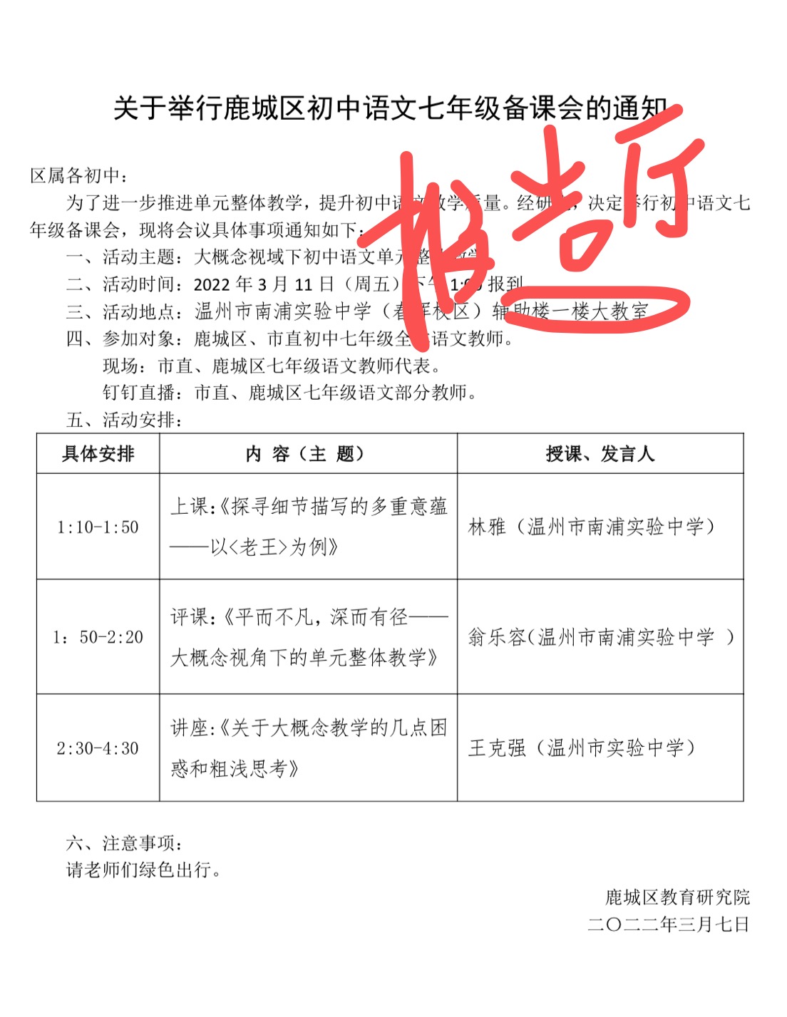 关于举行温州市程日东初中语文“名师送教”工作室第5次活动的通知