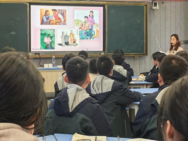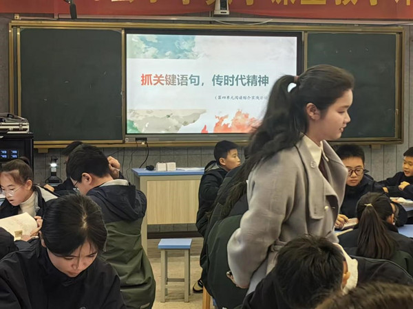 第二节课由桥墩一中的李民老师展示的第四单元阅读综合实践。课堂围绕“抓关键语句,传时代精神”这个主题展开, 第一个任务,找“关键句”请同学们摘录文章关键句,并按照关键句的位置、类型、作用角度分类,完成棋盘格。接着学生对上面表格的讨论中去发现、归纳和总结。第二个任务,品“关键句”。以小组合作的形式,从任务一中任选两句出自不同文章的关键语句,并可从句式、标点、关键词等品析句子含义,感悟文章传递的精神内涵。次任务学生最后以一人分析,一人板书,小组成员一起朗读的形式展示小组活动成果。第三个任务,用“关键句”。默读周简叔的《闻一多在西南联大(节选)》,完成“闻一多先生,我想对您说 ”的3分钟微演说。