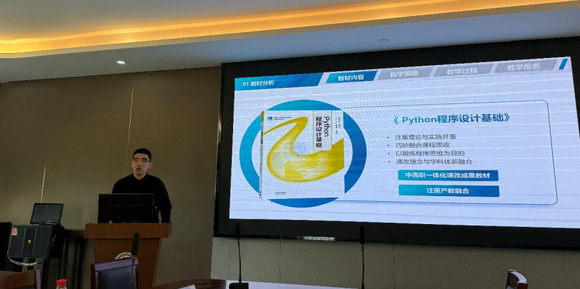 倪翰炜老师的说课题目为《Python累加算法——碳排放分组统计》。他重点展示了“双智能体实时纠错”和“AI生成HTML动画”两项设计:代码报错即时翻译、结果即时评价,抽象逻辑被转成可交互动画,配合课后学习画像推送,形成完整的高效能反馈闭环,充分体现项目化教学与AI深度融合的特点。